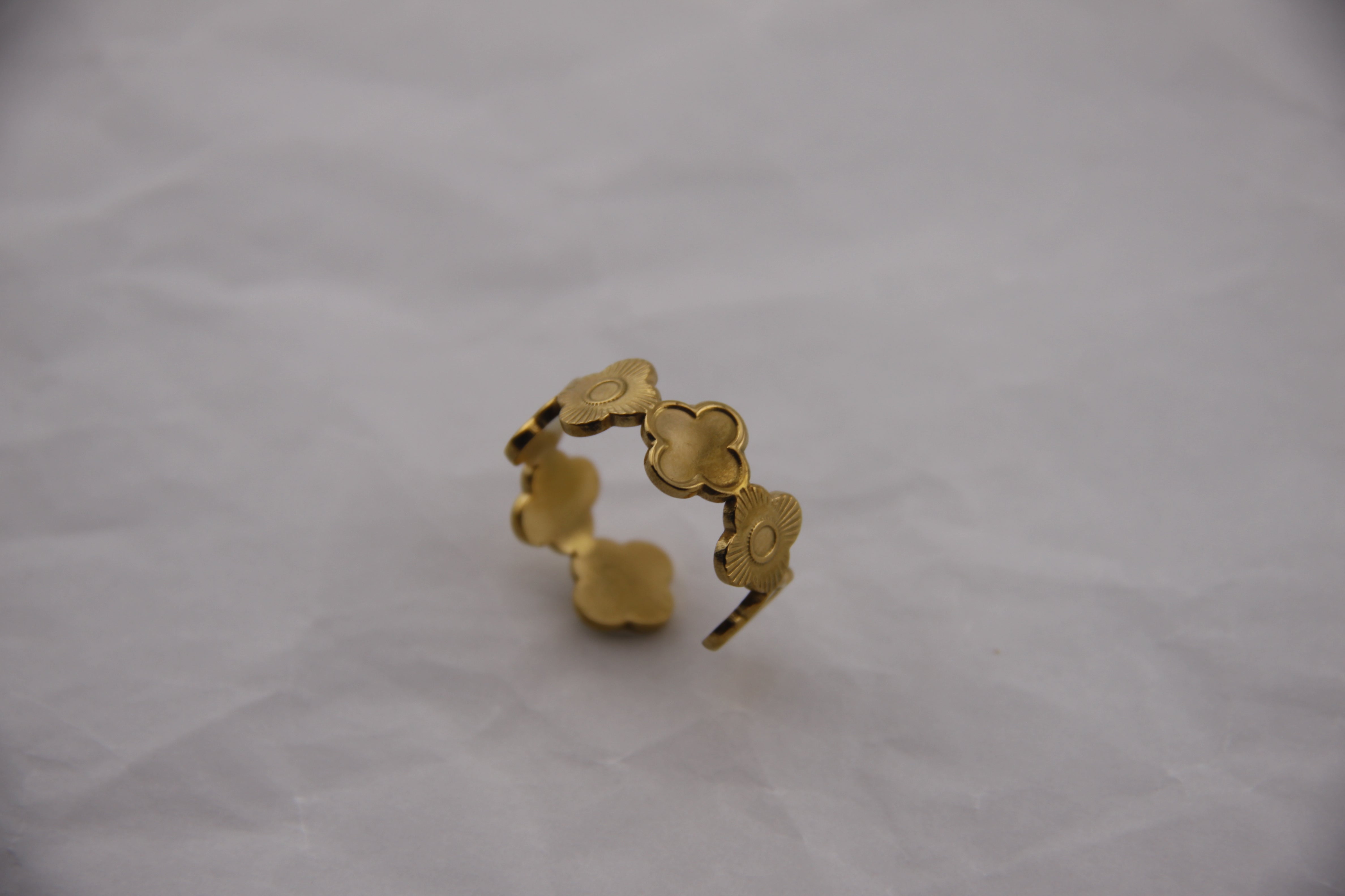 Este anel dourado combina delicadeza e presença numa peça que se destaca sem esforço. O design aberto adapta-se confortavelmente ao dedo, enquanto a estrutura é formada por uma sequência de flores estilizadas em baixo relevo, alternando entre contornos suaves e texturas gravadas com detalhe. O acabamento é fosco e subtilmente acetinado, o que lhe dá um brilho elegante e controlado.