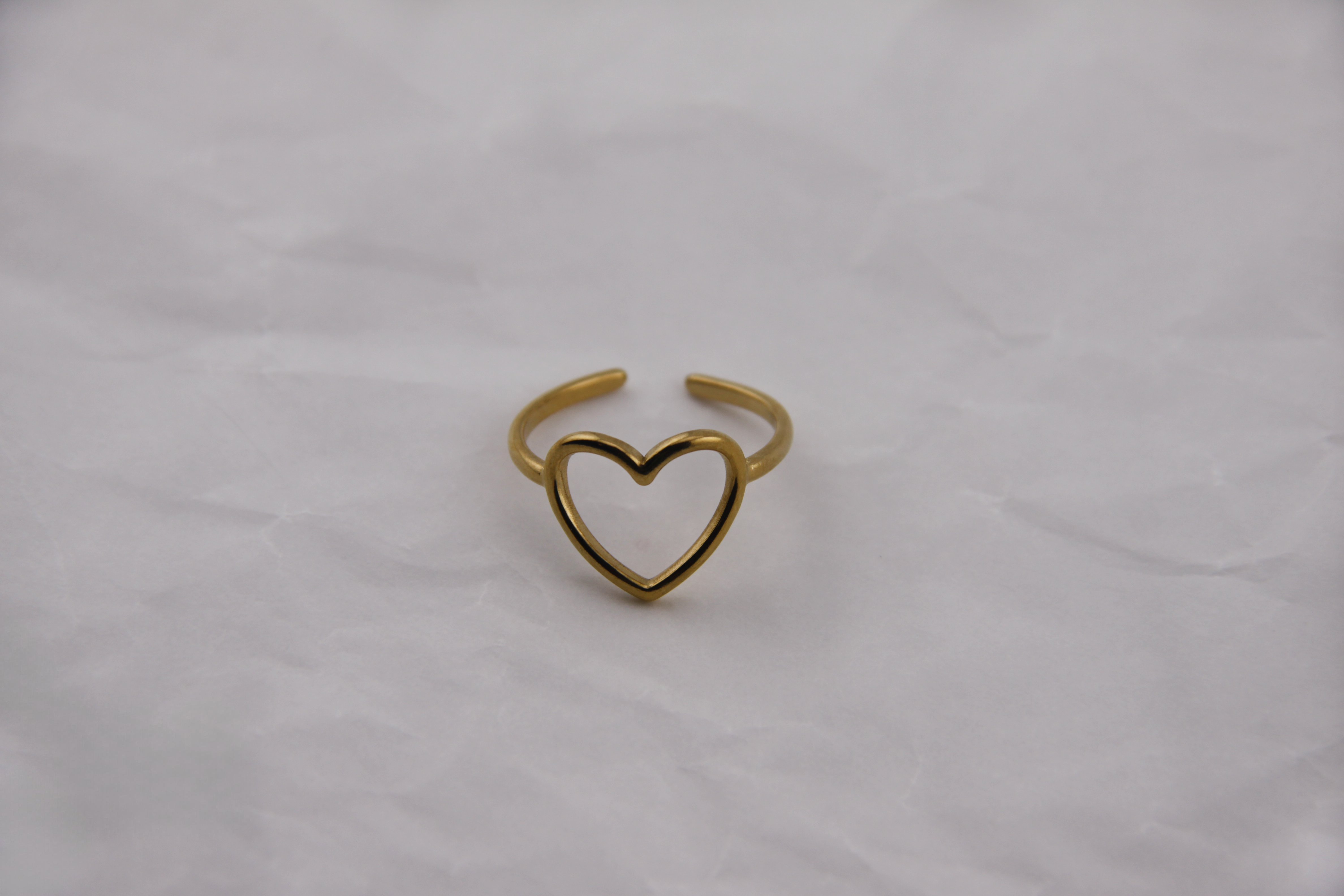 Este anel aposta na simplicidade com impacto. O coração desenhado com linhas abertas dá uma sensação de leveza e liberdade, enquanto o acabamento dourado mantém a peça sofisticada e versátil. Usa-o sozinho para um toque subtil ou combina com outros anéis para criar uma narrativa pessoal.