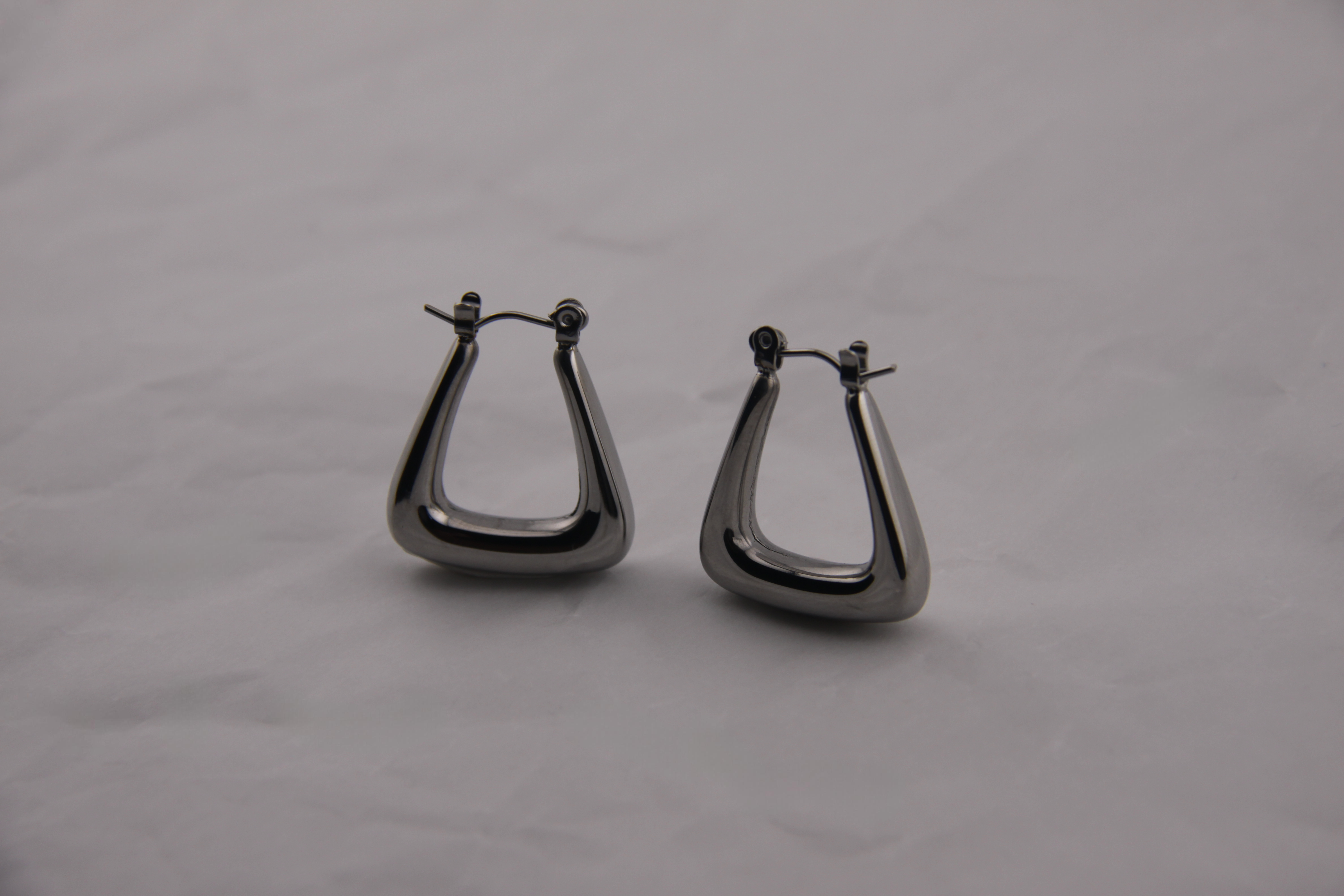 Estes brincos em aço inoxidável destacam-se pelo seu design ousado e contemporâneo, com uma forma triangular suave que captura a luz de forma elegante. A superfície polida e a cor grafite conferem-lhes um aspeto futurista.
