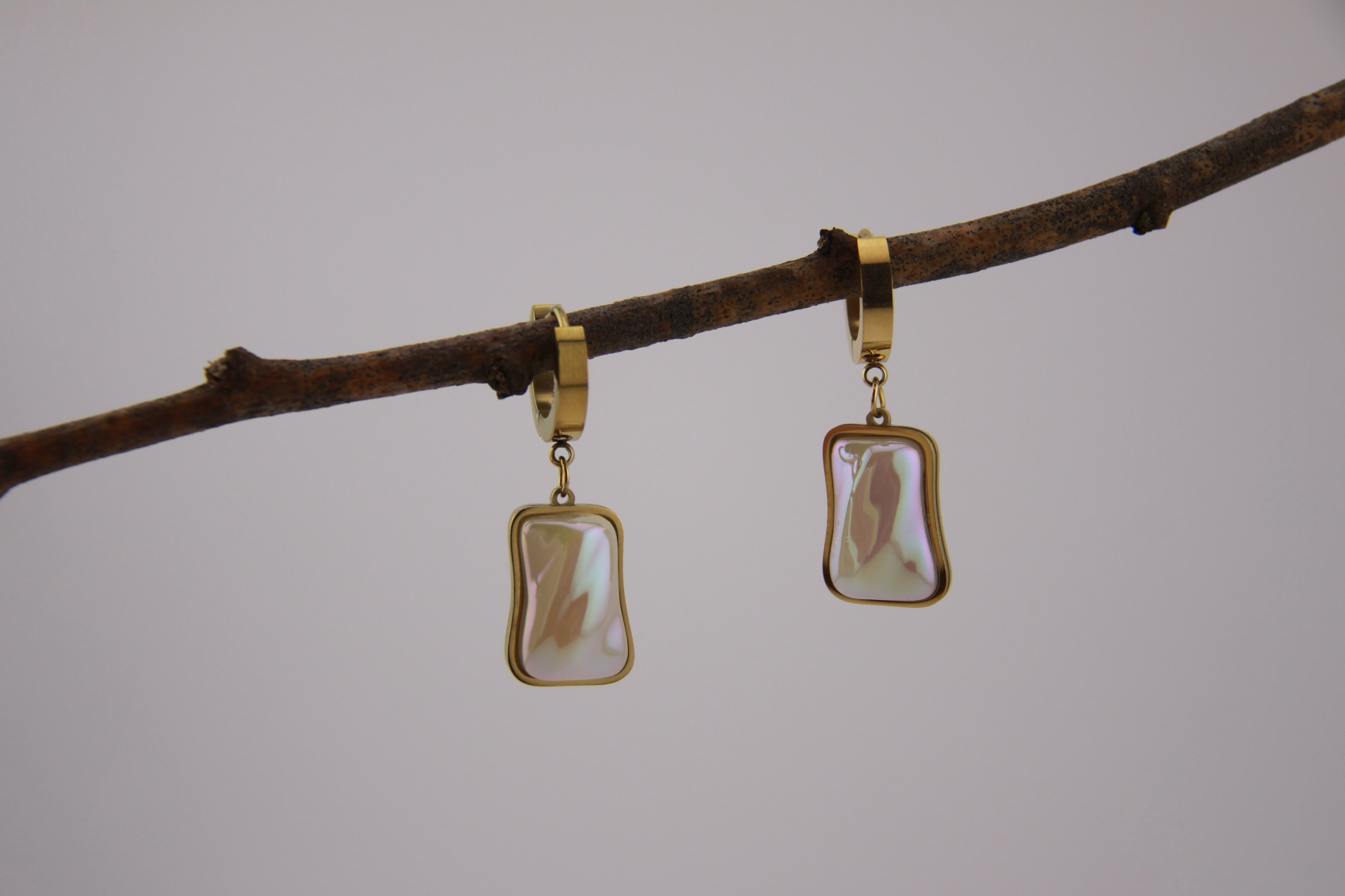 Estes brincos combinam uma estrutura dourada fina e minimalista com um pendente em pedra de formato livre que capta a luz de forma única, criando reflexos subtilmente iridescentes. A argola, de acabamento polido e design delicado, oferece um suporte leve e elegante, permitindo que o pendente seja o verdadeiro protagonista.