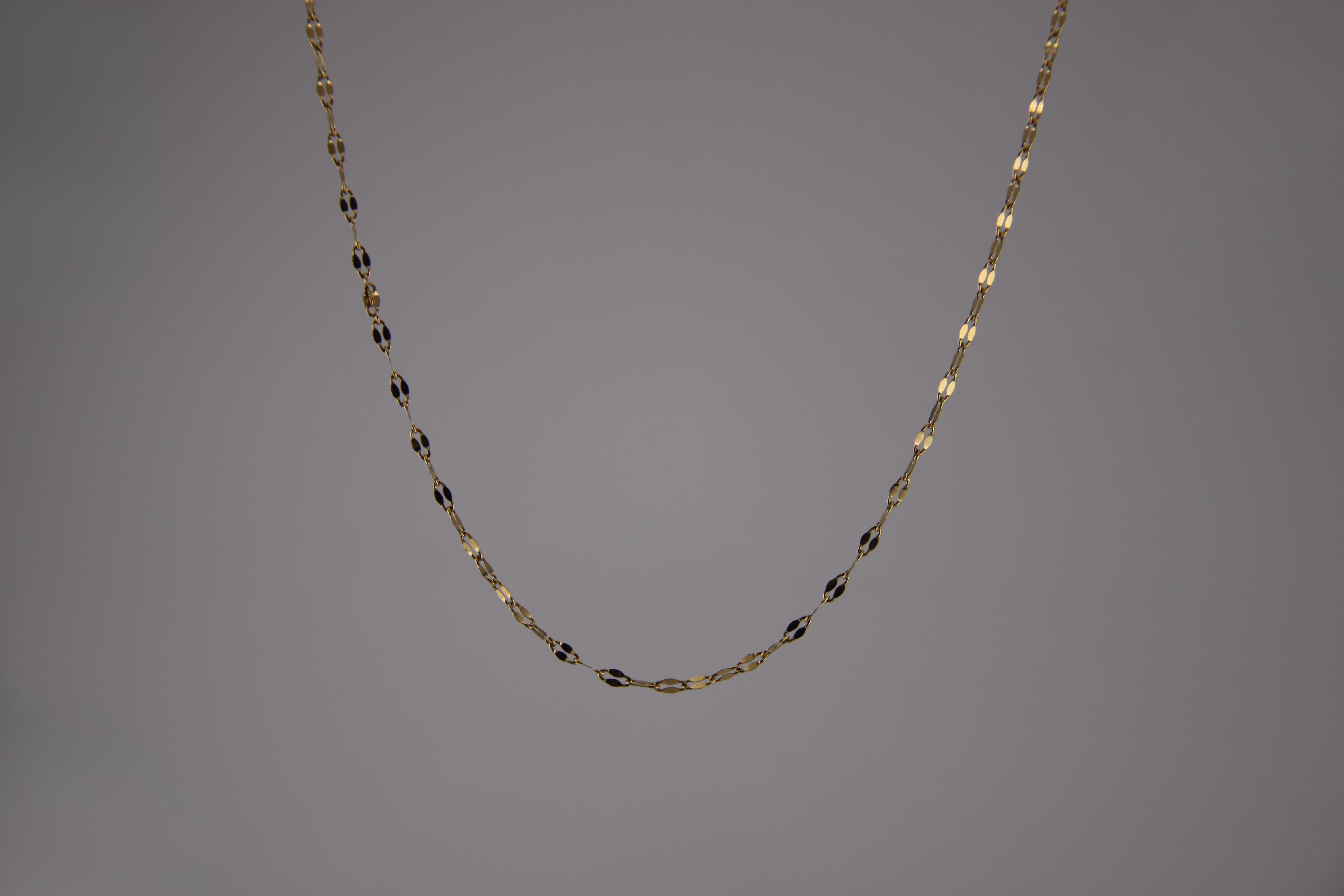 Cada elo parece ter sido torcido à mão para que a luz não escorra - mas se parta. Esta corrente cria um padrão visual que muda consoante o movimento. Não há repetição monótona. Há brilho ritmado, com textura que se sente no olhar antes de se tocar.