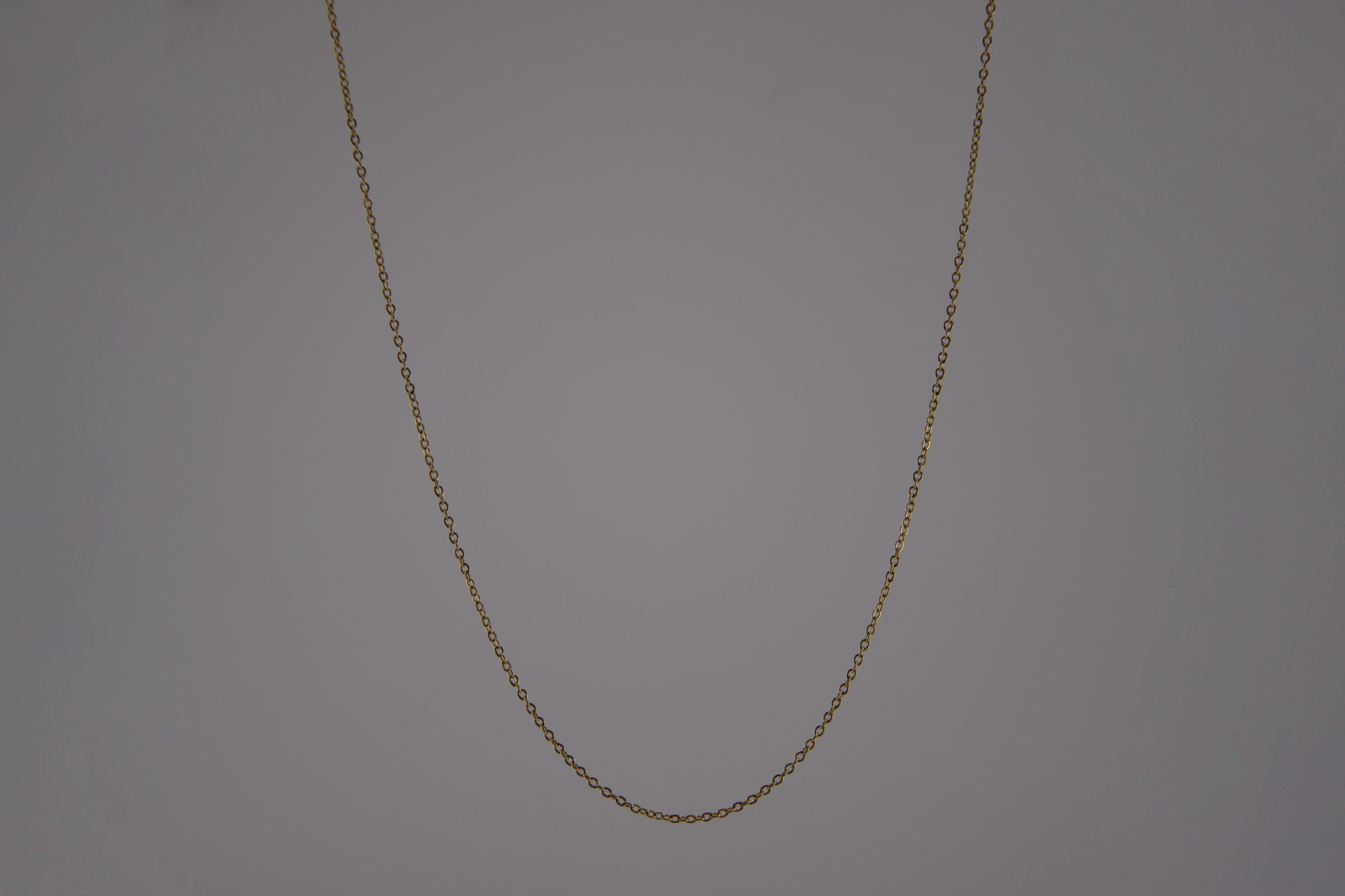 Esta corrente fina em aço inoxidável dourado, com elos pequenos e redondos, é o epítome do minimalismo elegante. Perfeita para quem prefere a beleza subtil, esta peça pode ser usada sozinha para um toque delicado ou integrada num look em camadas.