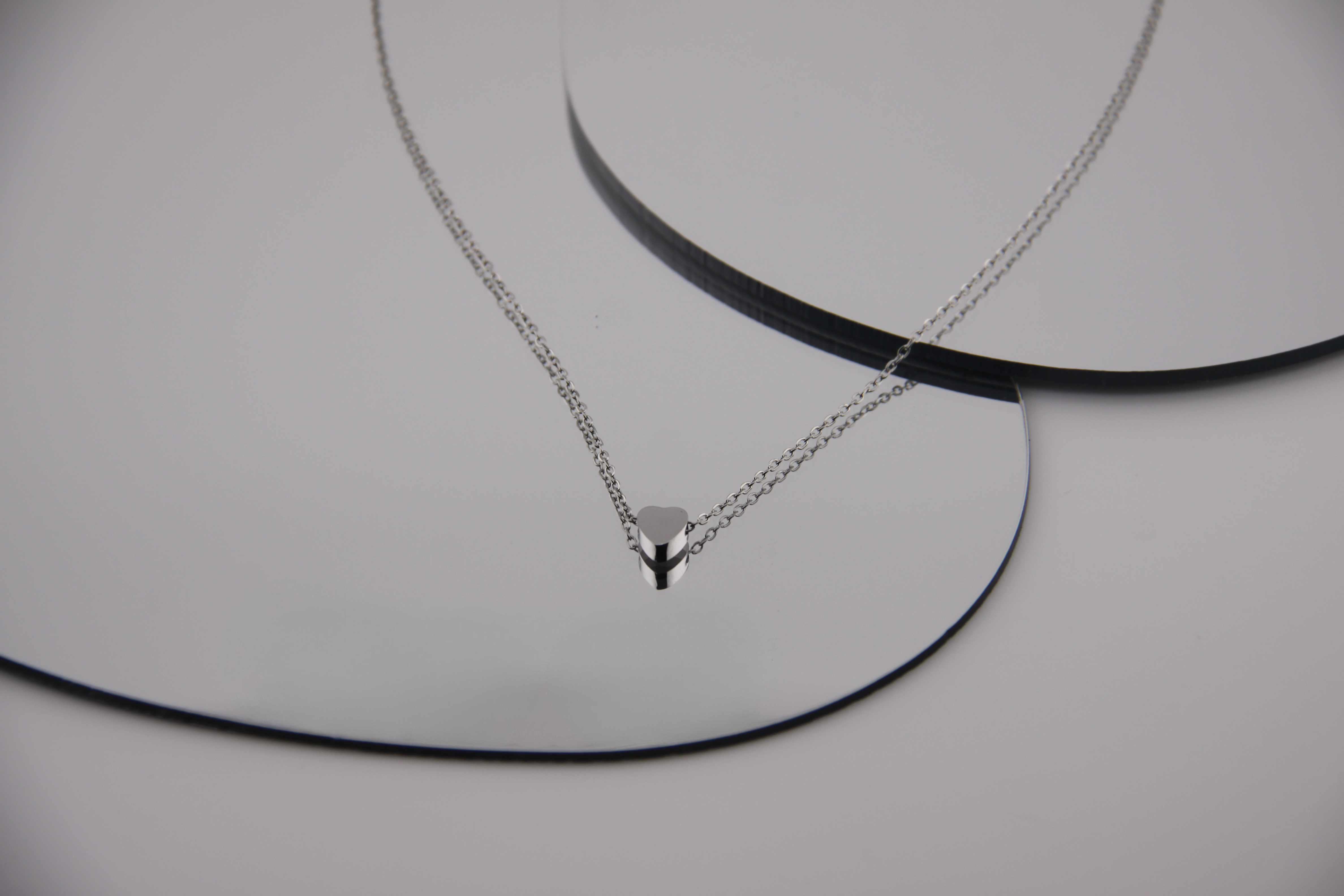 A corrente dupla, fina e simétrica, eleva o conjunto com um equilíbrio visual subtil, dando ao coração o protagonismo sem lhe levar a leveza. O brilho é discreto, o toque é suave, e o conjunto funciona com praticamente tudo: de uma camisola básica a um vestido mais cuidado.