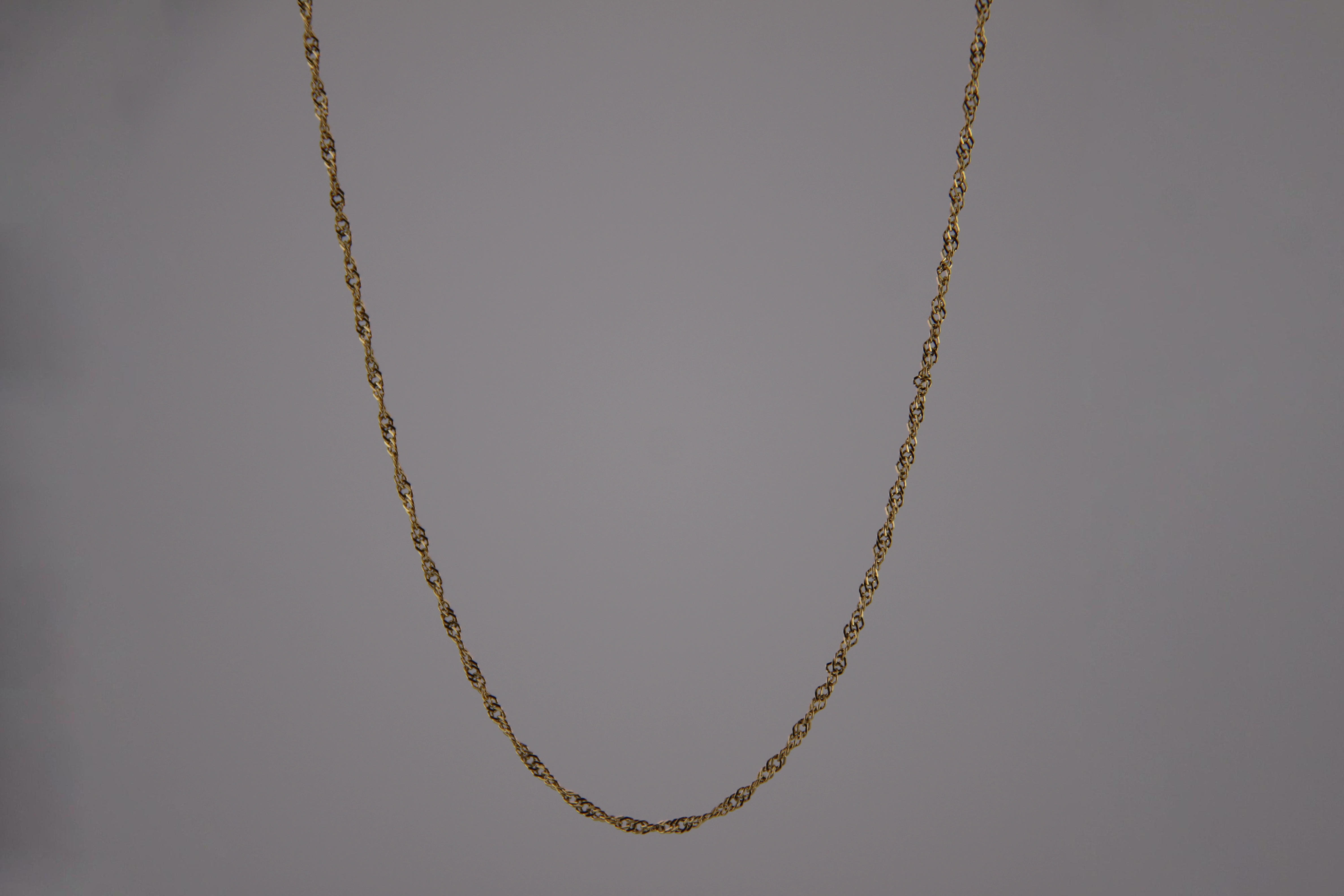 Esta corrente trançada é um desses casos - uma espiral dourada discreta, com textura minuciosa e reflexos suaves, que dança com a luz sem se impor. É delicada, mas não invisível. Fina, mas com personalidade. E o seu padrão contínuo confere-lhe um movimento natural e orgânico que a torna irresistivelmente versátil.