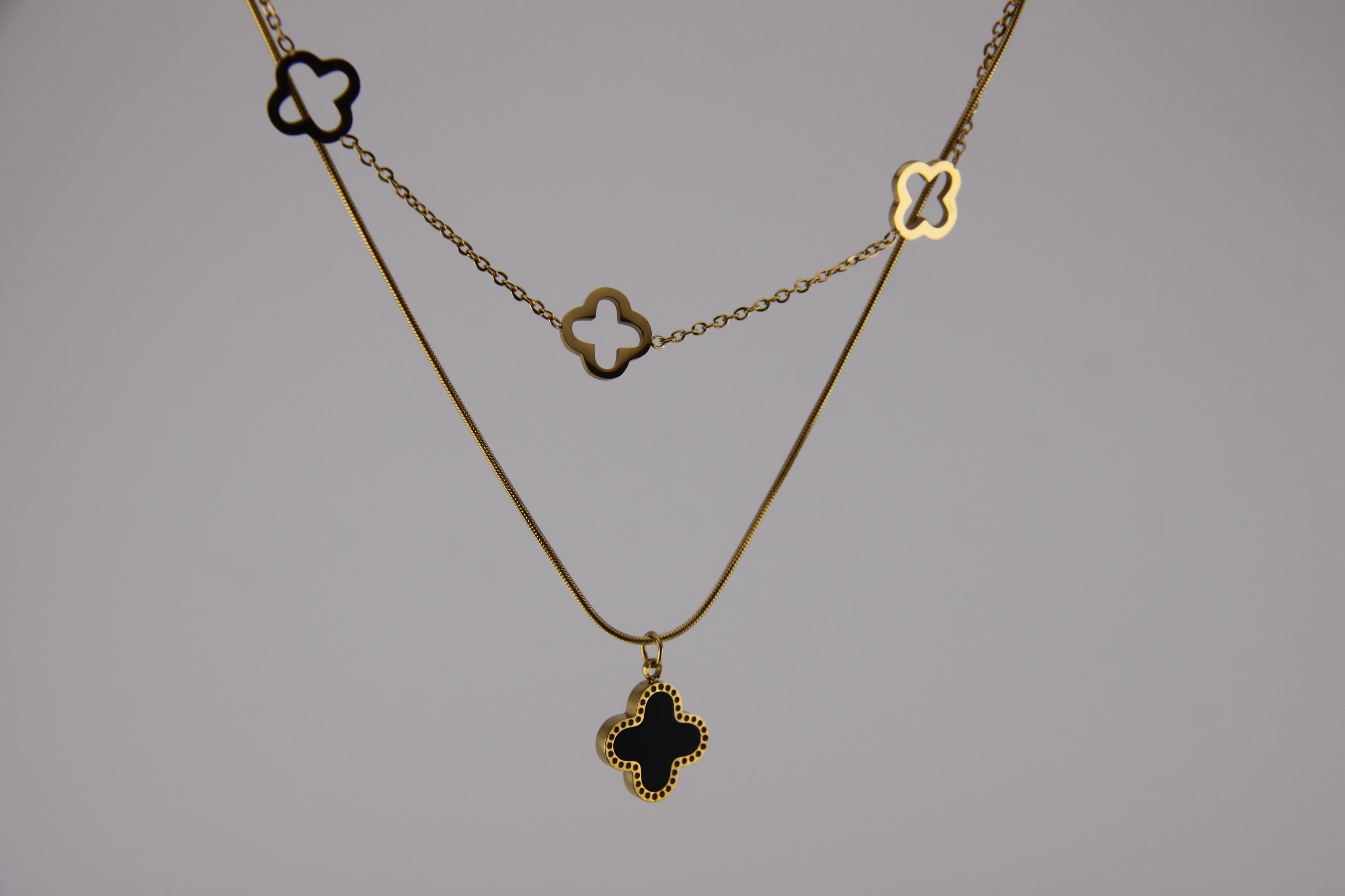 Este colar junta uma corrente lisa com um pendente escuro e profundo, a uma segunda camada leve, quase suspensa, marcada por formas geométricas ocas. O contraste é calculado, mas nada é certinho. A fluidez da composição quebra a monotonia.