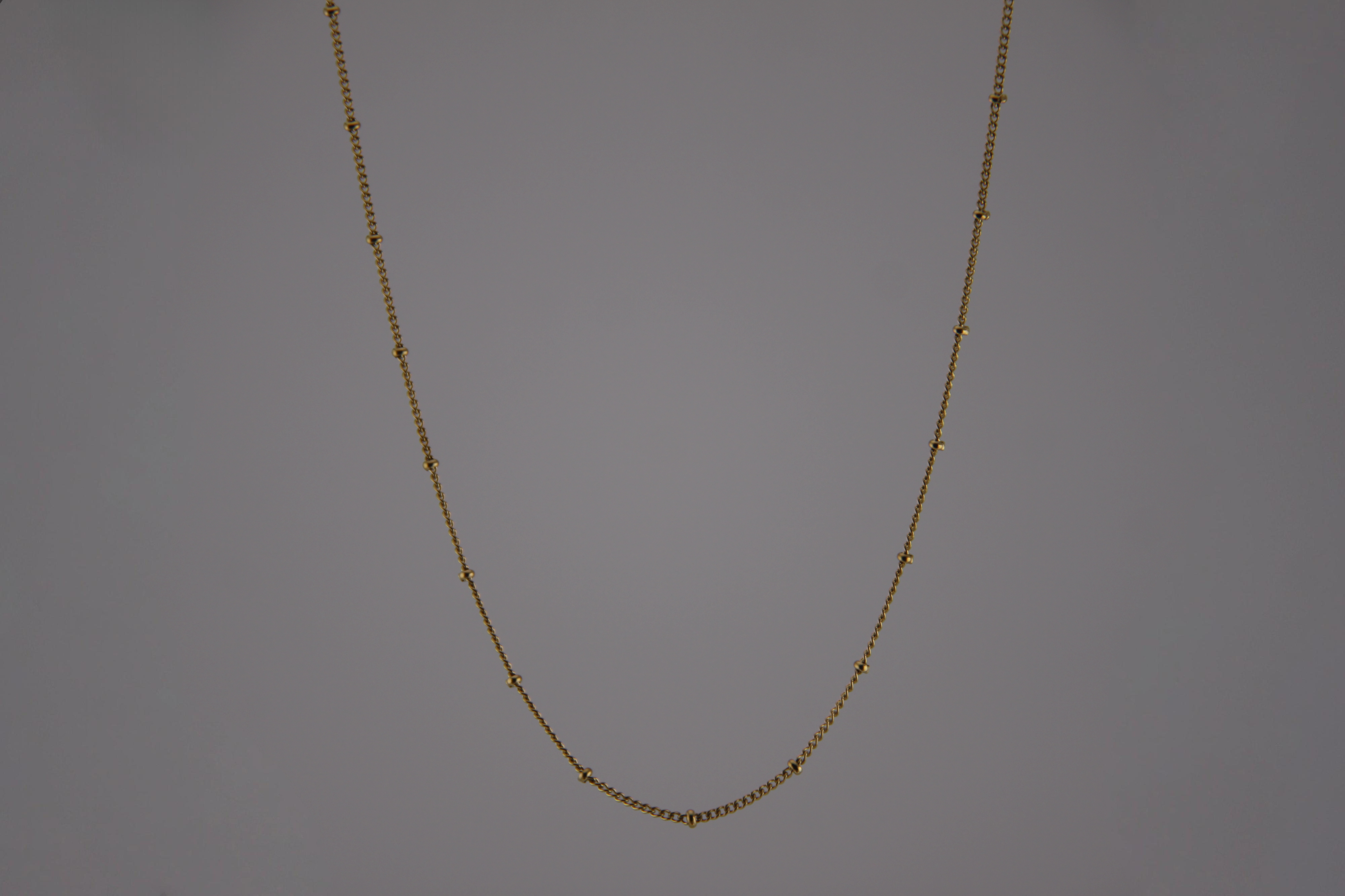 Esta corrente minimalista em aço dourado com esferas delicadamente espaçadas transforma o simples em especial. A estrutura leve e discreta é realçada por pequenos pontos de brilho ao longo da corrente, criando um efeito visual elegante e contemporâneo.
