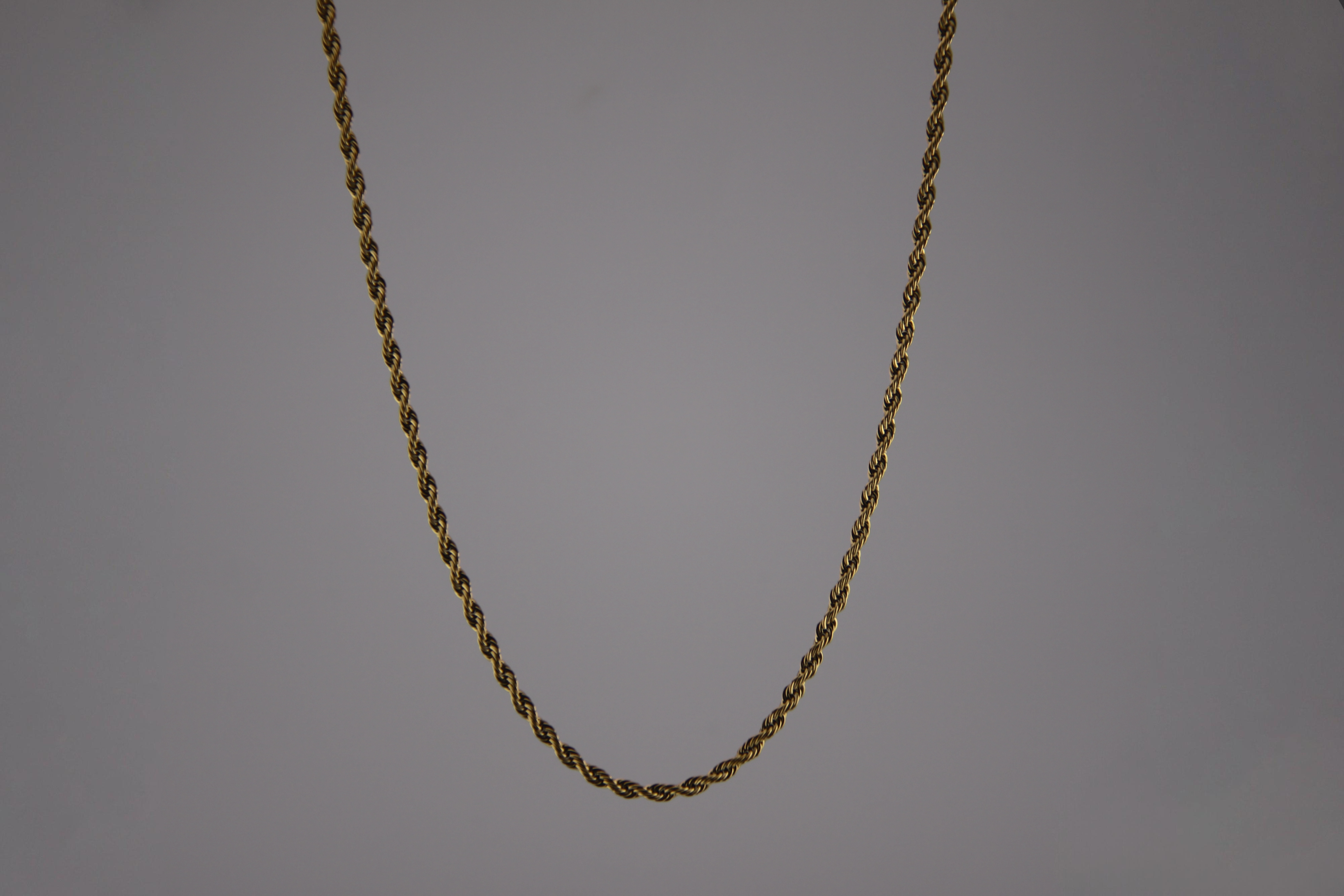 Com o seu entrelaçado firme e volumoso, esta corrente combina robustez visual com elegância atemporal. Os elos torcidos criam um padrão contínuo em espiral que reflete a luz de forma dinâmica, conferindo-lhe um brilho distintivo e profundo.